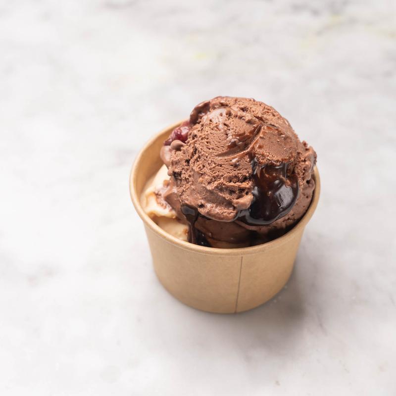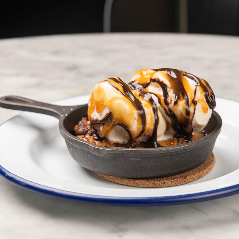 Chocolate chip cookie baked fresh in our oven topped with vanilla ice cream