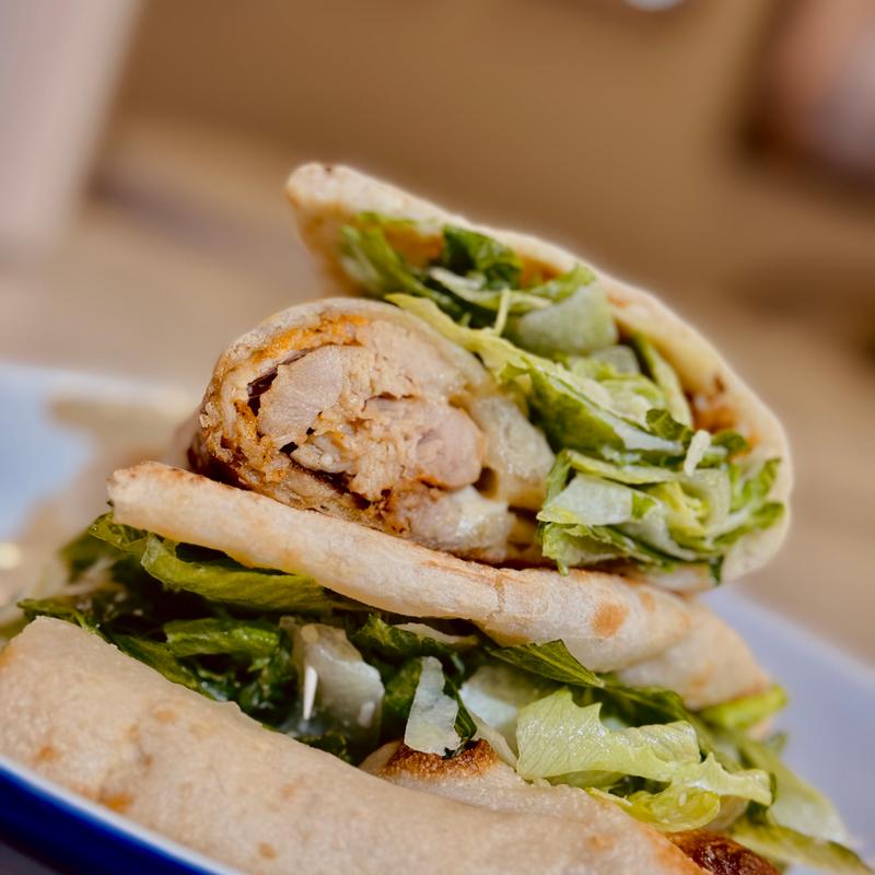 Wallet sandwich wrap made with pizza dough, filled with romaine lettuce, and chicken tossed in our house made caesar dressing