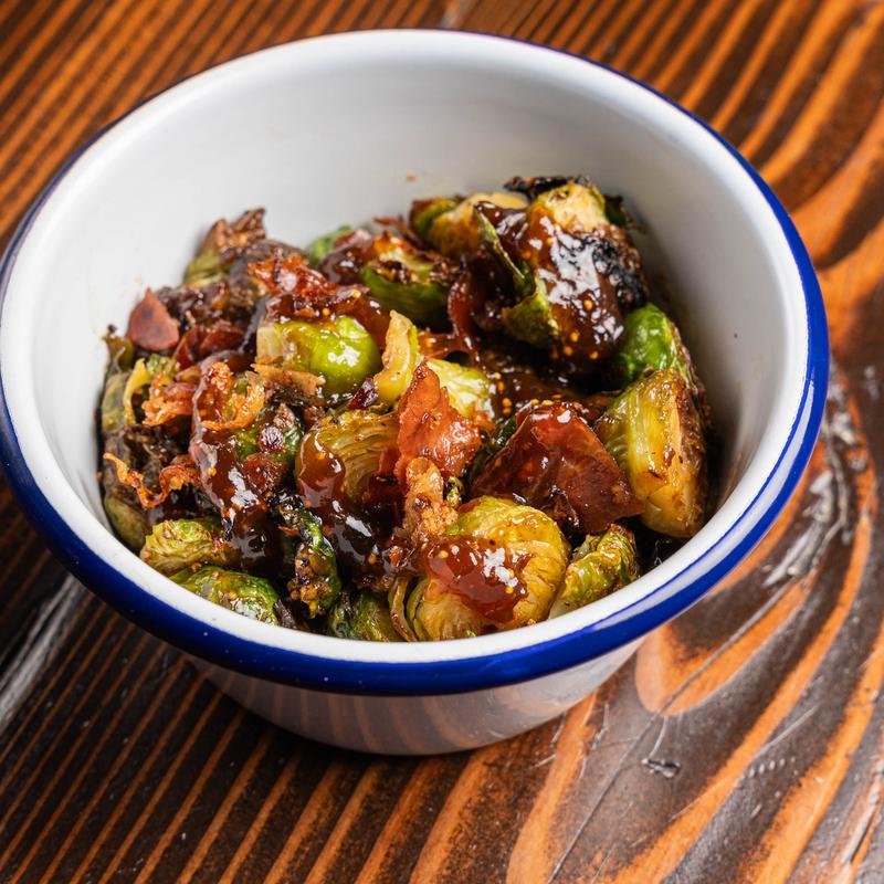 Oven-roasted brussels sprouts, served with shallots, red pepper flakes, fig spread, and cooked prosciutto