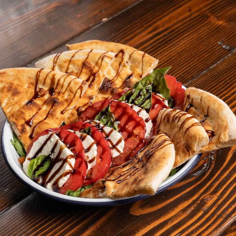 Fresh mozz, tomato, fresh basil, balsamic glaze, evoo served on a bed of arugula with a side of flatbread