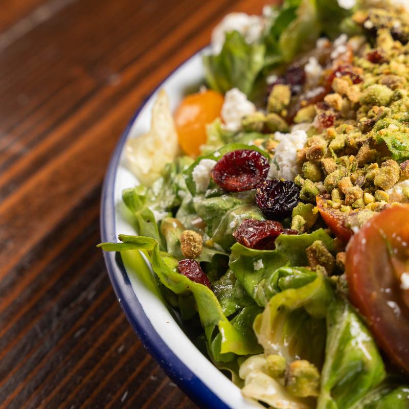 Balsamic dressing, butterlettuce, dried cranberries, pistachios, feta cheese, pancetta, and cherry tomatoes