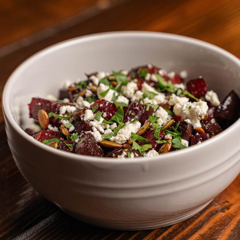 Wood fire oven-roasted beets served with pepitas, feta, and chimichurri sauce