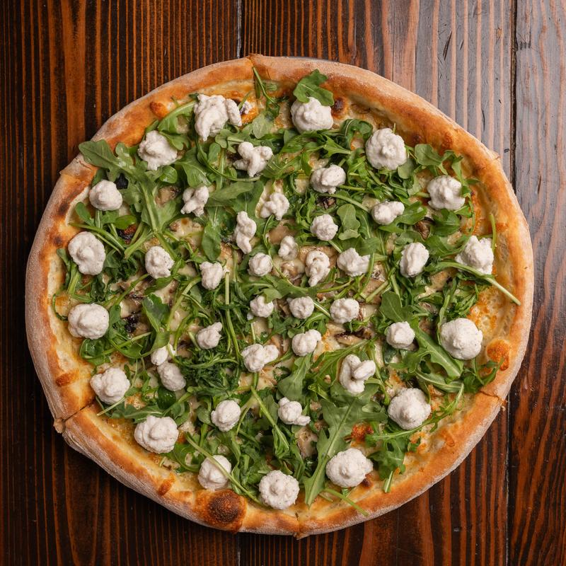 No red sauce, four-cheese blend, seasoned sauteed mushrooms, lemon nutmeg ricotta, and arugula